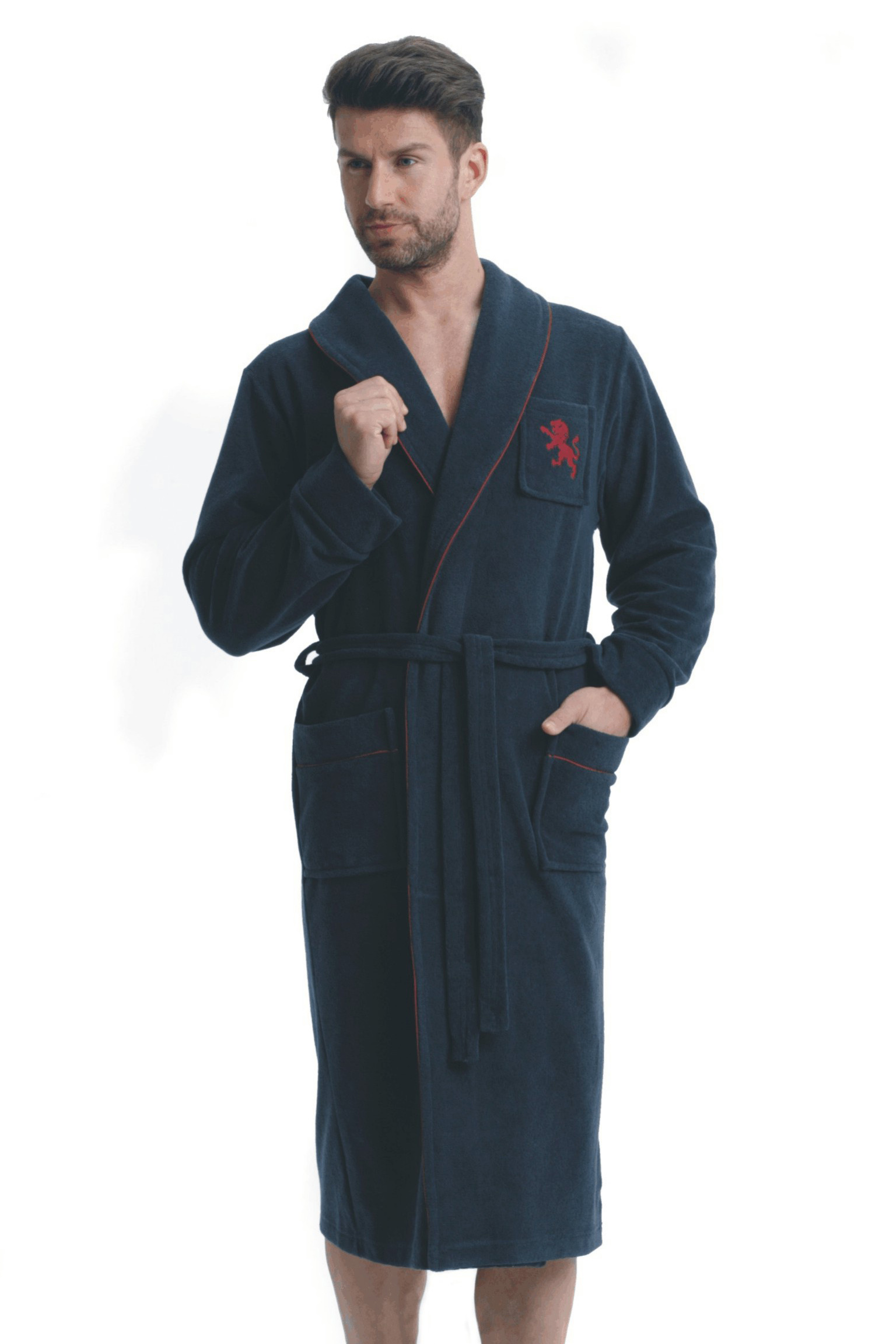 Męski szlafrok ze 100% bawełny drapanej od spodu. Posiada szalowy kołnierz wykończony bordową lamówką, pasek oraz dwie naszyte kieszenie o tym samym wykończeniu. Jest to elegancki model idealny dla dojrzałych mężczyzn ceniących sobie komfort i wygodę. Długość do połowy łydki.