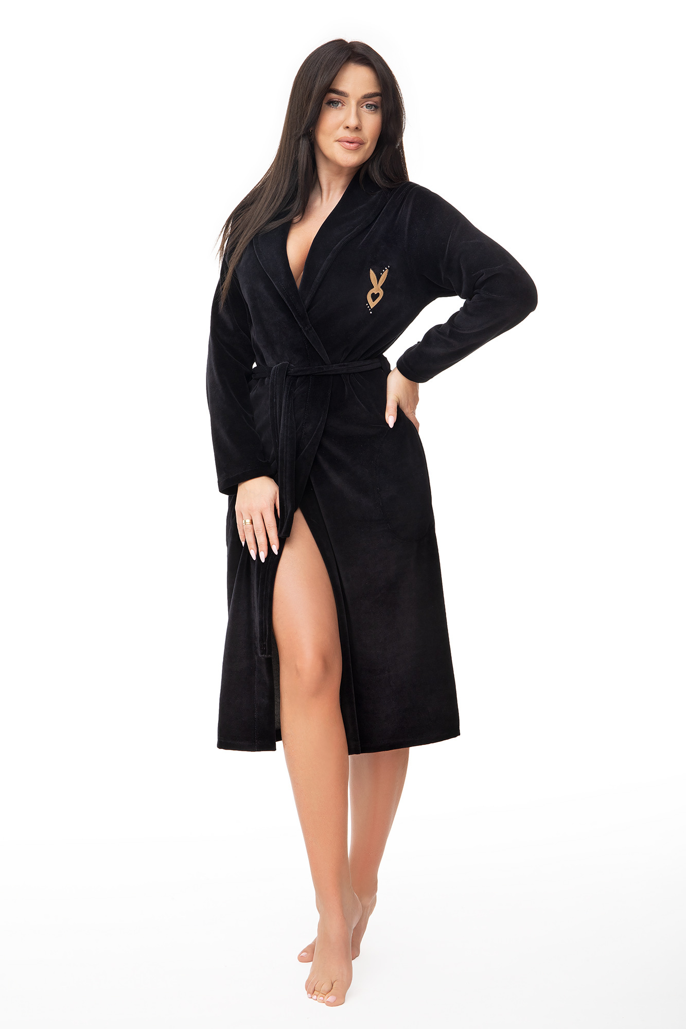 Jest to klasyczny i uniwersalny model dla kobiet. Szalowy kołnierz nadaje mu elegancji. Szlafrok jest delikatnie taliowany w pasie oraz posiada pasek, który dodatkowo umożliwia podkreślenie sylwetki. Kieszenie są chowane w szwie. Długość do połowy łydki. Na przodzie umieszczony jest delikatny haft w złotej aplikacji . Model dostępny jest w pastelowych ciepłych barwach. Szlafrok wykonany z wysokiej jakości materiałów polskiej produkcji z certyfikatem OEKO-TEX gwarantujący bezpieczeństwo dla skóry.