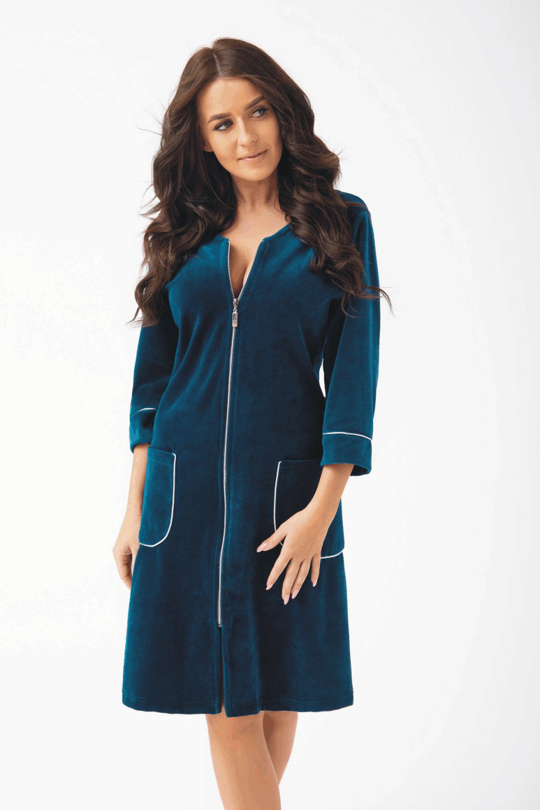 Elegancki welurowy szlafrok dla kobiet ceniących zarówno komfort, jak i elegancję. Wykonany jest z dzianiny typu welur. Długość za kolano, rękawy 3/4. Dodatkowo wykończony jest srebrną wypustką wokół kieszeni i mankietów. Zapinany jest na ozdobny zamek. Jego prosty krój doskonale sprawdza się jako odzież typu homewear, a rozcięcie na przodzie dodaje mu kobiecości.