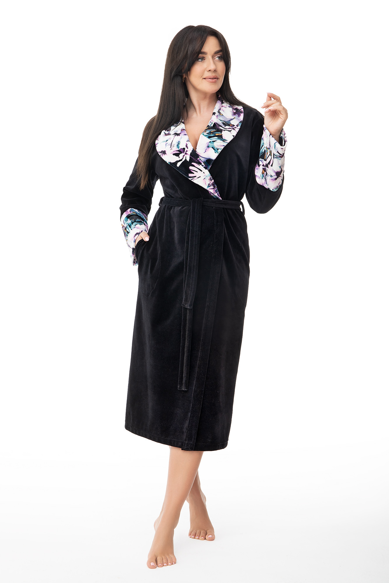 Klasyczny welurowy szlafrok z kołnierzem .Długość do połowy łydki ,wiązany w pasie . Jest to model przeznaczony dla osób ceniących komfort w połączeniu z elegancją .Kołnierz ,mankiety wykończone są dzianiną drukowaną z motywem kwiatów które nadają mu niepowtarzalnego charakteru idealnie się sprawdzi przy porannej kawie .
