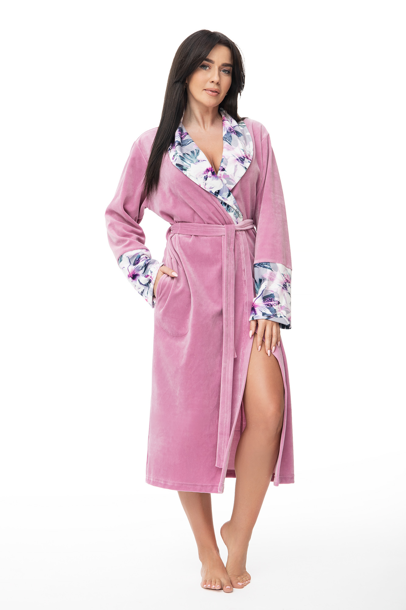 Klasyczny welurowy szlafrok z kołnierzem .Długość do połowy łydki ,wiązany w pasie . Jest to model przeznaczony dla osób ceniących komfort w połączeniu z elegancją .Kołnierz ,mankiety wykończone są dzianiną drukowaną z motywem kwiatów które nadają mu niepowtarzalnego charakteru idealnie się sprawdzi przy porannej kawie .