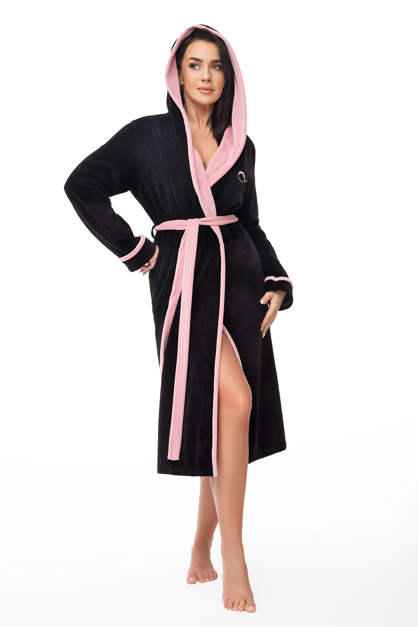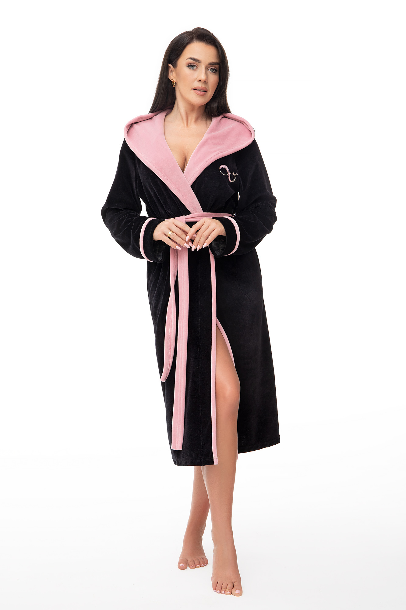 Szlafrok damski welurowy, długi z kapturem. Wiązany w pasie. Długi rękaw. Kieszenie ukryte w szwie szlafroka. Model wykończony jest ozdobną lamówką, nadającej mu kobiecego charakteru. Na lewym przodzie widnieje haft z motywem nieskończoności.