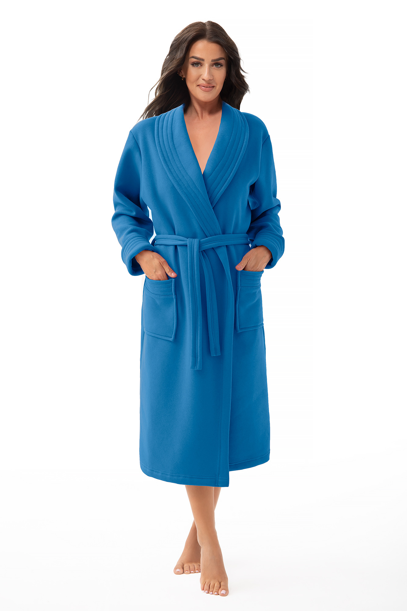 Jest to klasyczny i uniwersalny model dla kobiet dojrzałych. Szalowy kołnierz oraz mankiety przeszyte stebnówką nadają mu elegancji. Długość do połowy łydki. Model wiązany w pasie. Materiał, z którego jest wykonany to miękka i ciepła dzianina idealnie się sprawdza na chłodne wieczory i zimowe poranki.